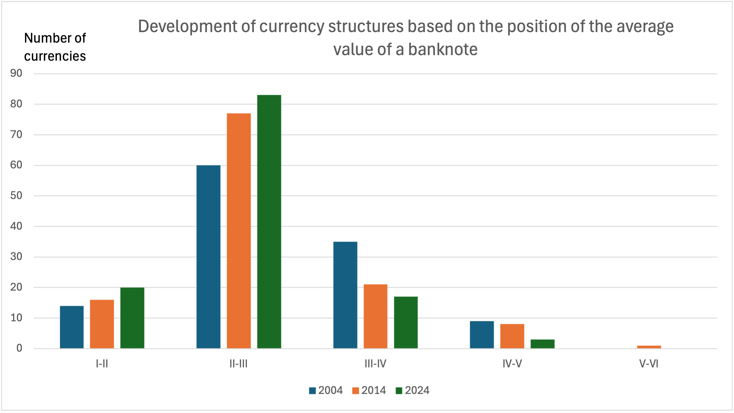 Fig 1: Development of currency structures based on the position of the average value of a banknote within the size order of denominations in 2004, 2014 and 2024