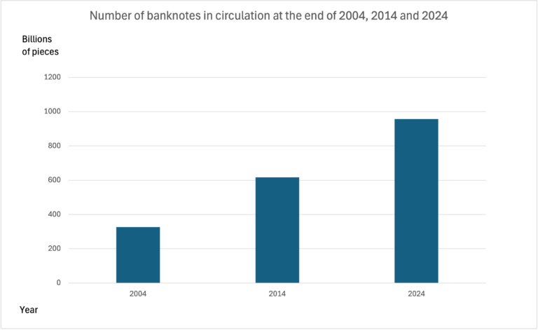 According to the study the number of banknotes at the end of 2004, 2014 and 2024 were respectively 325, 616 and 956 billion pieces. The percentual increase from 2004 to 2014 was 89%, and the respective increase during the more recent decade 55%. Hence, even if the growth rate has decreased, it has been on average 4.5¨% annually during the latter period.