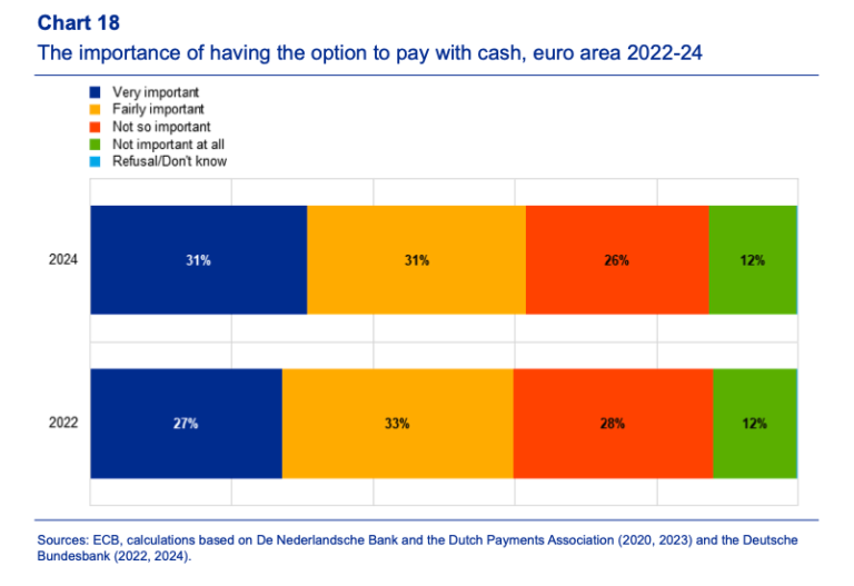 Consumers place increasing importance on maintaining access to cash. Having the option to pay with cash remains very or fairly important for 62% of the euro area population (Chart 18). The figure has increased by 2 percentage points since the previous SPACE survey in 2022. Many respondents consider cash is not just a payment method but also a safeguard in times of uncertainty or technical disruptions. The offline functionality of cash offers a level of resilience unmatched by digital alternatives, which can be vulnerable to network failures or security breaches.