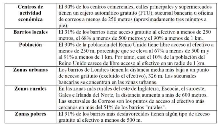 El informe de 2020 “Where to Withdraw? Mapping Access to Cash Across the U.K.” examinó la cobertura geográfica de los puntos de acceso al efectivo en el Reino Unido. Investigadores de la Universidad de Bristol colaboraron con la Autoridad de Conducta Financiera (Financial Conduct Authority) y el Regulador de Sistemas de Pago (Payment Systems Regulator) para reunir una base dede datos con 110,000 puntos de acceso al efectivo, incluidos cajeros automáticos gratuitos (FTU) y de pago por uso (PTU), bancos, sociedades de crédito hipotecario, cooperativas de crédito o sucursales de Correos, y puntos de reembolso de efectivo (cashback).