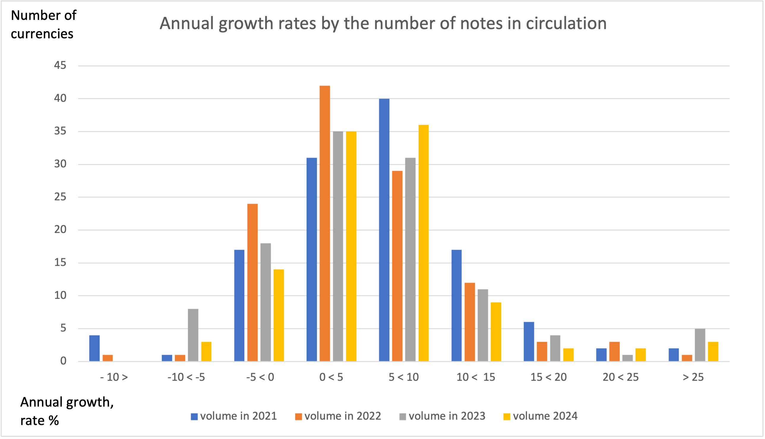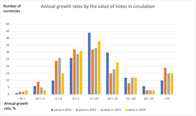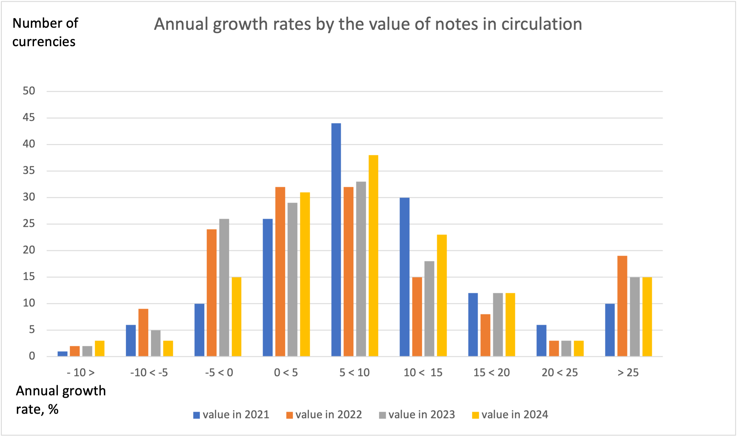 Figure 1: Annual growth rates by value of banknotes in circulation in 2021−2024 (143−145 currencies)