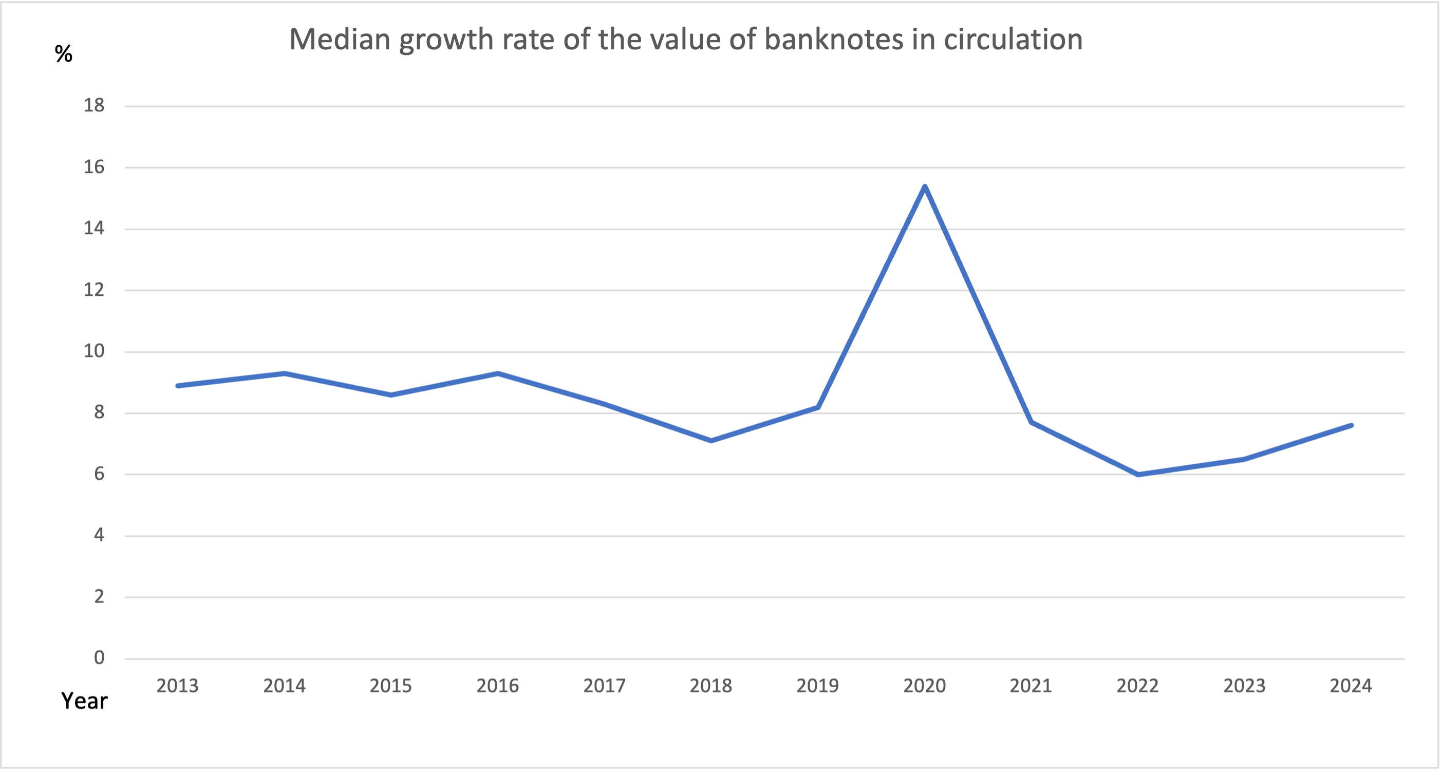 Whether there was a kind of return to normality in 2024 is further studied in Figure 2. It illustrates the annual median growth rate of the value of banknotes in circulation in 2013−2024.