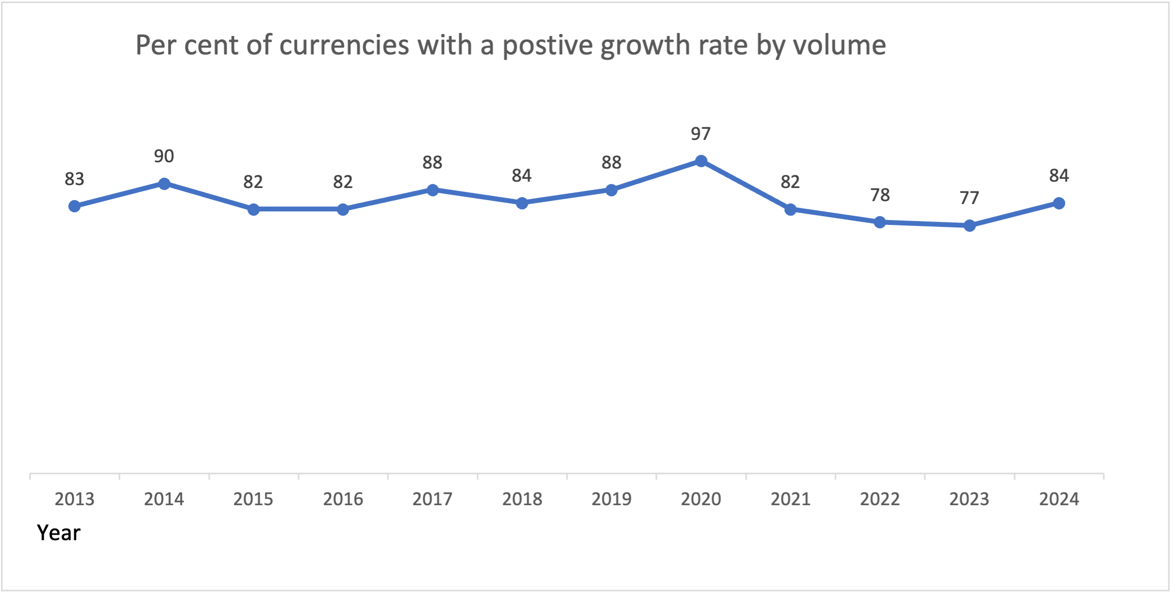 It is difficult to draw any firm conclusions on the direction of the volume development. It seems, however, again that the distribution in 2024 is closer to that in 2021 than those in 2022 and 2023.This assumption is further analysed in Figure 4 which illustrates the share of currencies with a positive growth rate in the years 2013−2024.