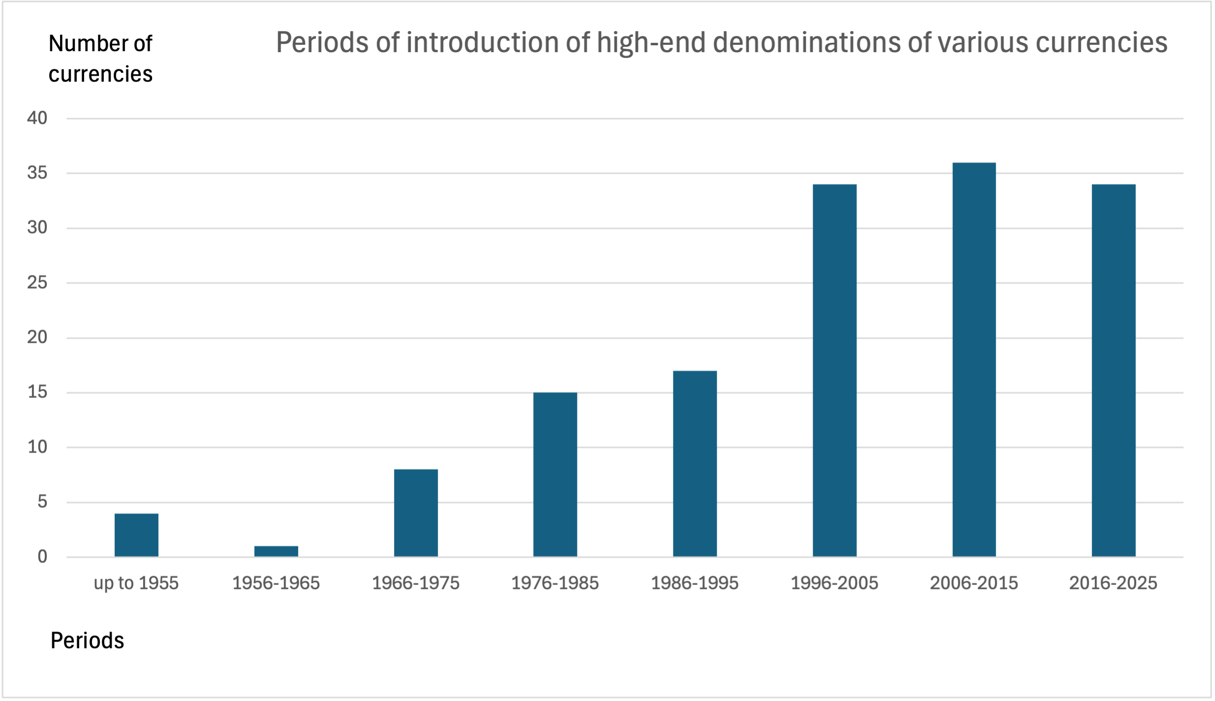 Historically, most issuing authorities regularly made inflation corrections to the currency structure. New higher denomination notes were introduced, and simultaneously low-end notes were replaced with coins. In the September analysis, it was concluded that this is only partly true regarding the low end.