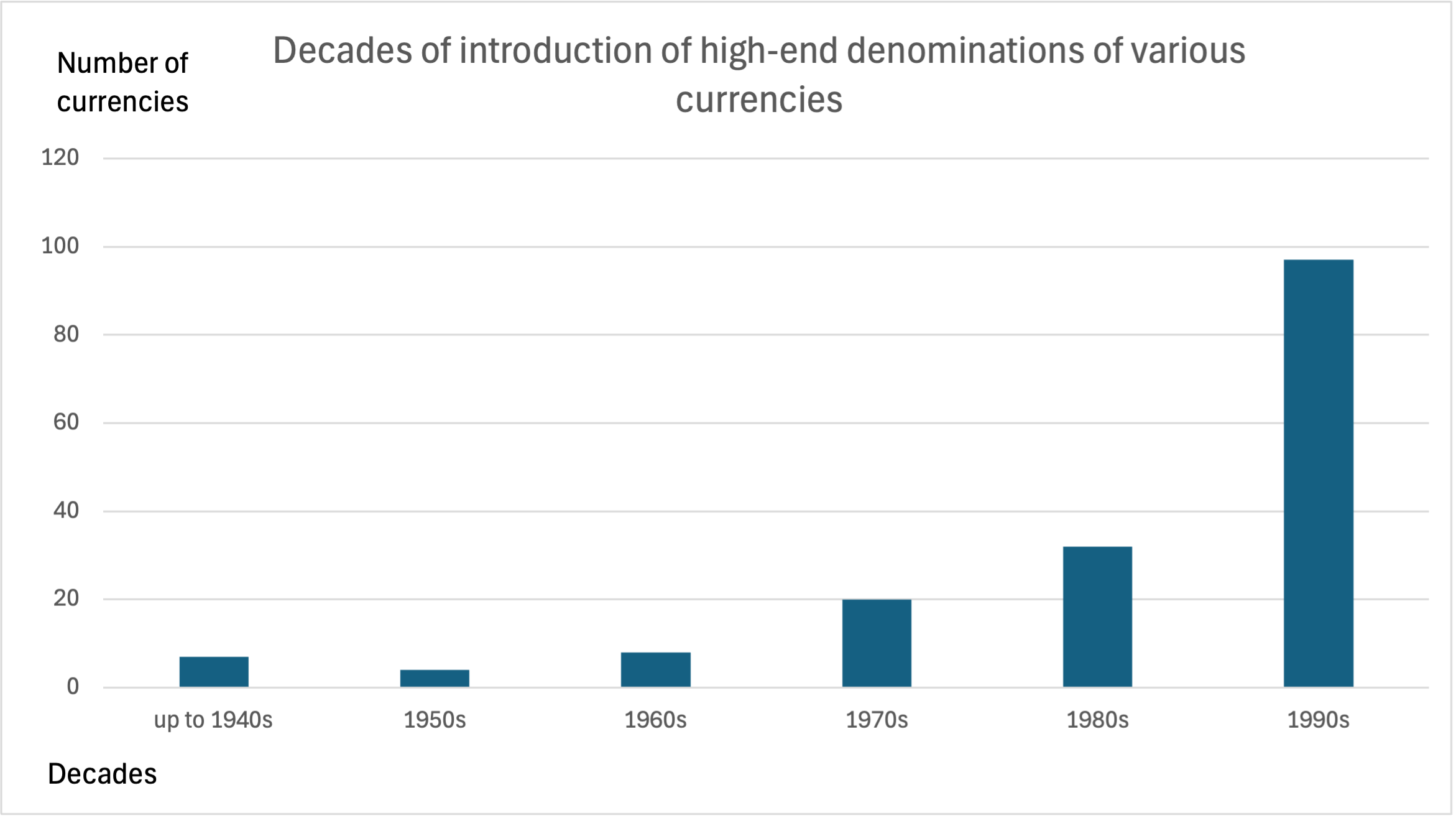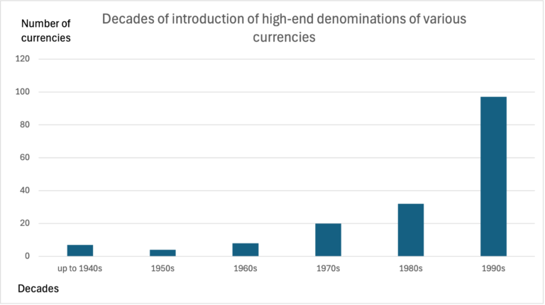 According to Fig. 6, a new high-end denomination was introduced by close to 100 currencies during the 1990’s, while there were still very few instant payment alternatives to cash for high-value payments. Hence, even if the world inflation was decreasing in 1990’s from the double-digit figures of 1980’s, the mindset of issuing authorities hadn’t changed. They still saw the need to issue new high-end notes, as reflected in Fig. 6.